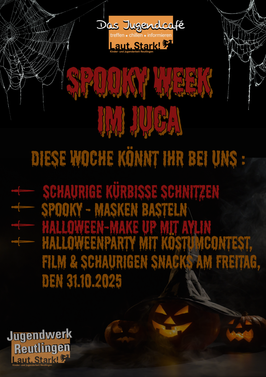 Traut euch… und kommt zu unserer berühmten und schaurig-schönen Spooky Week!Diese Woche erwartet euch ein unheimlich buntes Programm:🕯️ Schauriges Kürbisschnitzen 😈 Bastelt eure eigenen Spooky-Masken💀 Als krönender Abschluss: unsere legendäre Halloweenparty am Freitag! Freut euch auf schauriges Halloween-Make-up, einen Kostüm-Contest, bei dem die gruseligsten Gestalten gekürt werden und einen Gruselfilm. Zieht eure düstersten Kostüme am